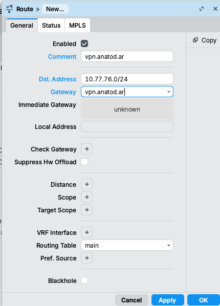 Una vez conectada la VPN hay que crear la ruta para poner conectarse al sistema, ya que está en otra subred.
